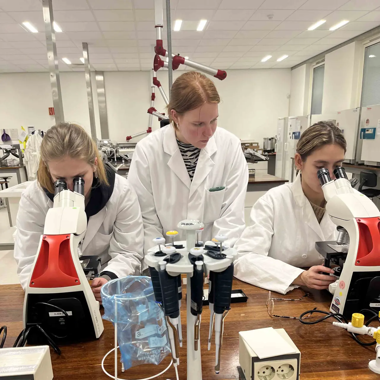 Vanuit dit onderzoek zijn de studenten aan de slag gegaan. En niet zomaar, maar met een onverwachte cross-over: laboratoriumtechniek! ‘Eerlijk gezegd dachten we eerst allemaal: wat moeten wij met elkaar? Maar als ik iets heb geleerd tijdens mijn opleiding, is dat samenwerken met mensen met andere interesses het beste is wat er is. Je leert zoveel nieuwe dingen, en leert op een andere manier naar dingen kijken. Dus hebben we water onderzocht onder een microscoop. Je denkt misschien: water is toch gewoon doorzichtig, daar kun je toch niks in zien? Maar dat is dus niet waar.'